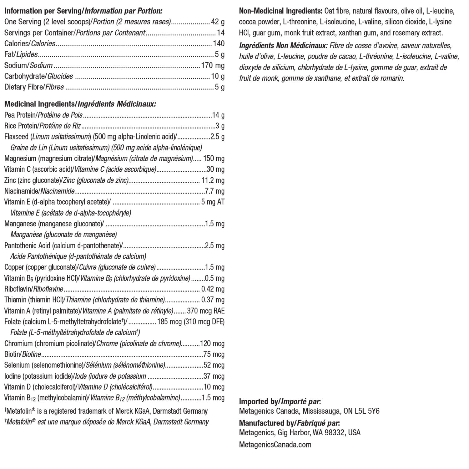 Non-Medicinal Ingredients: Oat fibre, natural flavours, cocoa powder, olive oil, L-leucine, L-threonine, L-isoleucine, L-valine, silicon dioxide, L-lysine HCl, guar gum, xanthan gum, monk fruit extract, and rosemary extract.