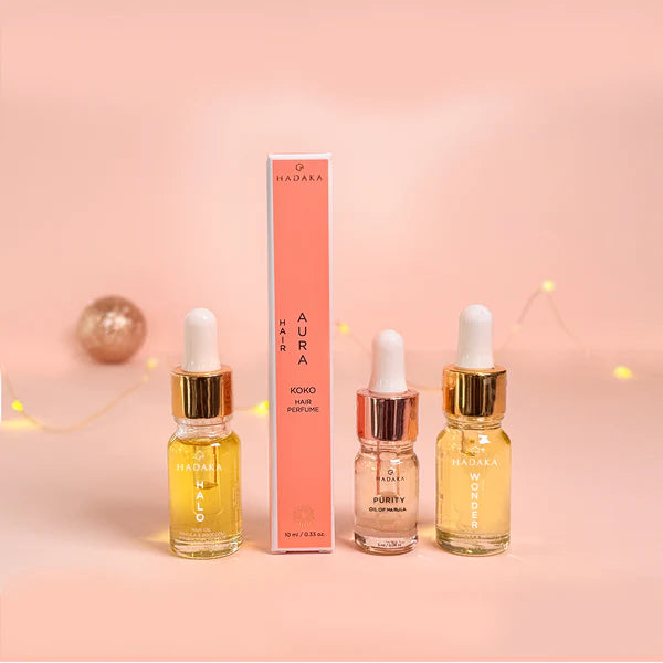Enriched with the mini-sized HALO hair oil, indulge your hair with a nourishing blend of organic oils that promote strength, shine, and manageability.