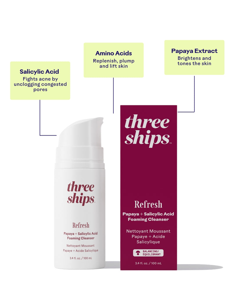 What is the difference between Refresh and Purify? Refresh is designed for oily/acne-prone skin whereas Purify is formulated for dry/normal skin. Refresh contains Papaya Extract which will brighten and balance skin tone and Aspen Bark Extract (naturally-derived salicylic acid) to combat breakouts and leave the skin feeling refreshed. Purify contains Amino Acids to replenish, plump and lift the skin and Aloe Vera which will hydrate and repair. You can use Refresh and Purify interchangeably during your routine to target different concerns.